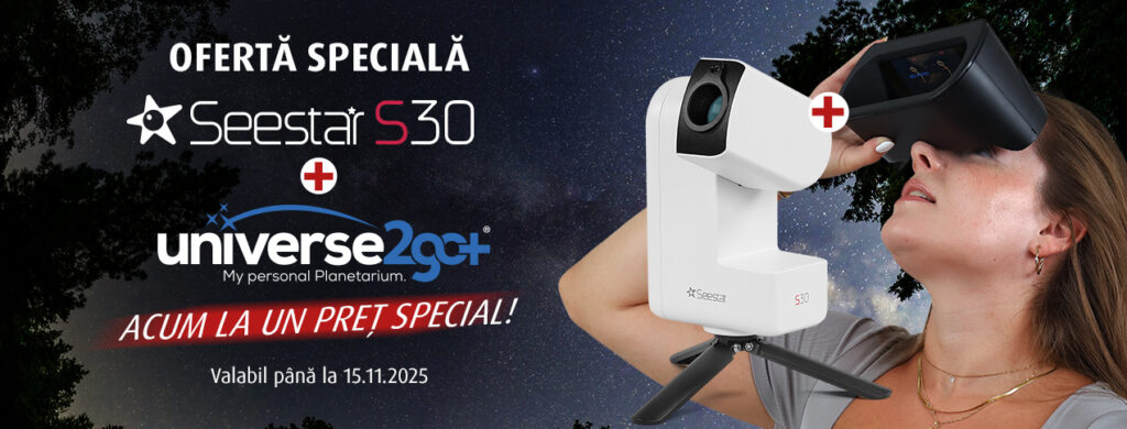 Acum există o ofertă grozavă pentru toți pasionații de astronomie: inteligentul ZWO Seestar S30 împreună cu planetariul portabil Omegon Universe2go+ într-un pachet accesibil!