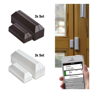 Primiți un set de 3 cu câte o unitate de senzor și o unitate de contact, care sunt montate pe foaia ușii/fanionului ferestrei și pe rama ferestrei/ușii, opuse una alteia. Pentru senzori sunt disponibile capace de acoperire maro sau albe, în funcție de designul ferestrelor și ușilor dumneavoastră.