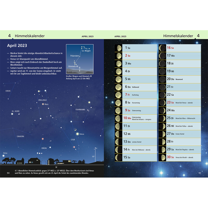 Fie că doriți să descoperiți constelații pe cer, să recunoașteți o planetă sau să observați următoarea eclipsă de lună, în Kosmos Himmelsjahr veți găsi informații detaliate despre toate „evenimentele cerești”: