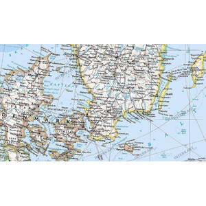 Harta murală a Scandinaviei prezintă, de asemenea, fiorduri, zone lacustre, drumuri importante, aeroporturi, capitale și numeroase localități.