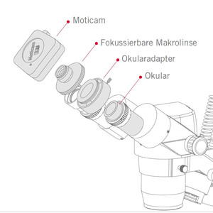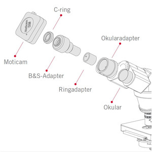 Conectați pur și simplu lentila macro focalizabilă la cameră și alegeți adaptorul ocular potrivit pentru microscopul dvs. Apoi, așezați combinația completă pe ocular și microscopul dvs. convențional s-a transformat într-un microscop digital. Această soluție poate fi utilizată și pe microscoape care nu sunt Motic.