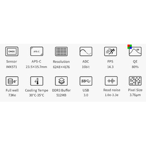 - Rezoluție înaltă datorită pixelilor de 3,76 µm - ideală pentru telescopele luminoase și clare, precum Apos, Hyperstar, Celestron Faststar, telescopele Newton luminoase
