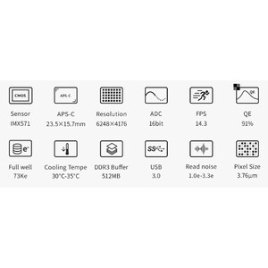 - Rezoluție înaltă datorită pixelilor de 3,76 µm - ideală pentru telescopele luminoase și clare, precum Apos, Hyperstar, Celestron Faststar, telescopele Newton luminoase