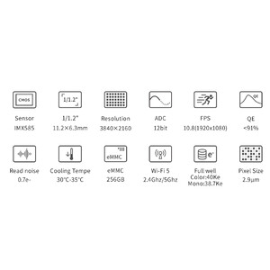 WLAN dual band: Antena externă dual band, care acceptă atât frecvențe de 2,4 GHz, cât și de 5 GHz, permite utilizarea stabilă și fără probleme a camerei pe o rază de 20 de metri. Cu aplicația ASIAir de la ZWO, puteți controla camera și vizualiza imaginile cu ușurință pe smartphone.