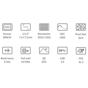 Această camera este echipată cu un senzor modern de 1,6" cu 3552*3552 Pixeli. Pe lângă tehnologia modernă Starvis 2 (cu iluminare din spate), IMX676 oferă o imagine extrem de clară, fără strălucire amplificată (Amp-Glow) - dar convinge mai ales prin rezoluția foarte mare de 2,0 µm pixeli, precum și prin rata de cadre relativ mare. Camera este astfel potrivită în special pentru următoarele aplicații: