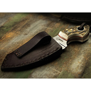 Böker Plus Gnome de Jesper Voxnæs impresionează prin compactitatea sa extremă, care asigură un confort deosebit la purtare. Lama este fabricată din oțel 440C, mânerul din corn de cerb tradițional este prevăzut cu straturi de fibră roșie. Acestea oferă o prindere excelentă, în ciuda dimensiunilor reduse, și fac ca acest cuțit să fie nu numai plăcut la atingere, ci și un companion util la vanatoare. Mânerul din corn de cerb este montat cu un nit tubular mare și un știft mozaicat. Oglinda lamei este lustruită, iar muchia este satinată longitudinal. Livrare cu curea de piele și teacă din piele maro de înaltă calitate, cu buclă pentru curea.