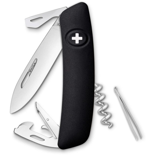 Cuțitul elvețian SWIZA D03, cu design revoluționar de 360° și suprafață robustă antiderapantă, se potrivește perfect în mână. Datorită formei ușor curbate a cuțitului, uneltele sunt ușor accesibile și, datorită perforațiilor continue pentru stângaci și dreptaci, ușor de deschis: lamă de 75 mm cu blocare de siguranță, vârf de înțepat și găurit cu ac, deschizător de sticle cu șurubelniță nr. 3 și îndoitor de sârmă, deschizător de conserve cu șurubelniță nr. 1, tirbușon și pensetă.