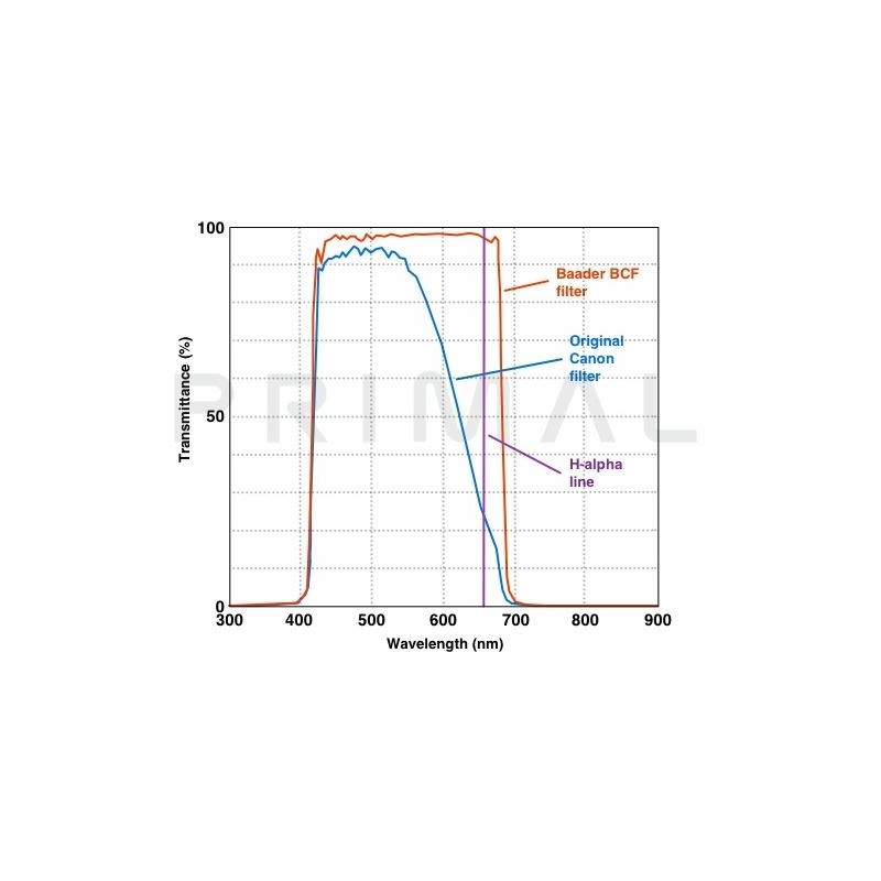 Conversia (astromodificarea) este efectuată de compania PrimaLuceLab din italia prin înlocuirea filtrului original Canon cu filtrul BCF de la Baader Planetariu, care a fost special dezvoltat în acest scop în Deutschland. Puteți vedea diferența în ilustrația "Curba de transmisie".