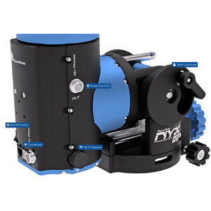 NYX este zeița nopții din mitologia greacă, iar Pegasus Astro oferă acum sub acest nume o montură performantă cu tehnologie Harmonic Drive și o sarcină utilă de până la 14 kg - și asta fără a fi nevoie de contragreutate! De aceasta se ocupă tehnologia de transmisie Harmonic Drive/Strainwave. Transmisia asigură o funcționare fără joc, cu un cuplu ridicat. O carcasă din aliaj de aluminiu, complet frezată CNC, anodizată în negru și albastru, precum și o selecție de componente de înaltă calitate (motoare pas cu pas, angrenaje cu arbori) din interiorul monturii asigură o funcționare fără erori timp de mulți ani.