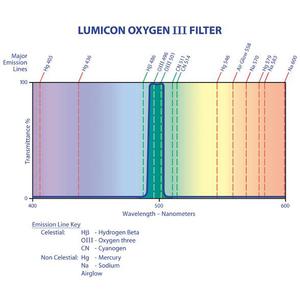 Legendarul filtru de banda ingusta Lumicon OIII izoleaza doar cele doua linii de emisie ale oxigenului la 496 si 501nm, care sunt emise, de nebuloasele planetare si cele difuze. Drept urmare aceste obiecte de slaba intensitate pot fi observate mai bine pe fondul unui cer negru. Filtrul Lumicon OIII va ofera o imagine aproape fotografica ale unor nebuloase cunoscute cum ar fi Veil, Ring Nebula, Dumbell, Orion si a multor alte nebuloase. Sunt obtinute cele mai bune rezultate indiferent daca observati pe un cer cu poluare luminoasa sau pe un cer cu conditii foarte bune de observare. Veti impresionat de tot ce veti vedea cu filtrul O III.