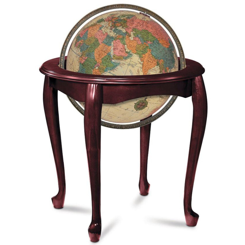 Modelul "Queen Anne" se inspiră din eleganța Europei secolului al XVIII-lea. Cu suportul său solid în aspect de lemn și meridianul din fontă, designul său este convingător și astăzi. Harta în stil antic îndeplinește cele mai moderne cerințe și conferă fiecărei camere de zi un aspect elegant. Când este iluminat, sunt vizibile și rutele marilor exploratori, precum și lanțurile muntoase și șanțurile oceanice.