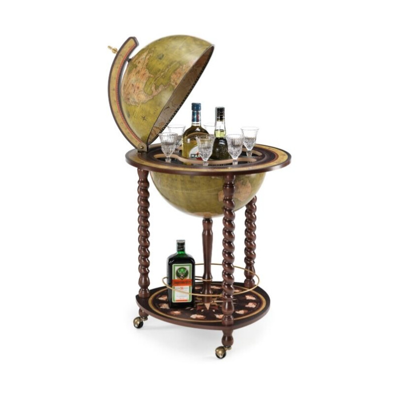 Elegantul glob de bar oferă în interior un compartiment pentru 9 pahare și 2-3 sticle. Pe suprafața de depozitare inferioară, decorată cu culori naturale pe bază de apă, pot fi depozitate sticle suplimentare. Harta reprezintă o reproducere fidelă a celei din secolul al XVI-lea.