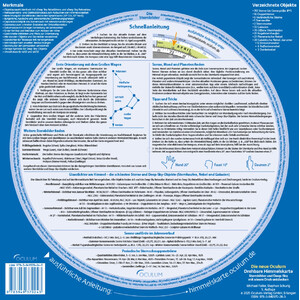Pe verso se explică modul de utilizare și se oferă sfaturi suplimentare pentru observatii, precum și date despre obiecte cerești selectate și o previzualizare a evenimentelor astronomice importante. De asemenea, pe verso veți găsi un link către pagina de internet a editurii. Acolo, sub produsul „Harta cerului rotativă”, puteți vedea traiectoria actuală a Soarelui, Lunii și planetelor, precum și cerul înstelat actual. Cu această completare, harta cerului este atemporală!