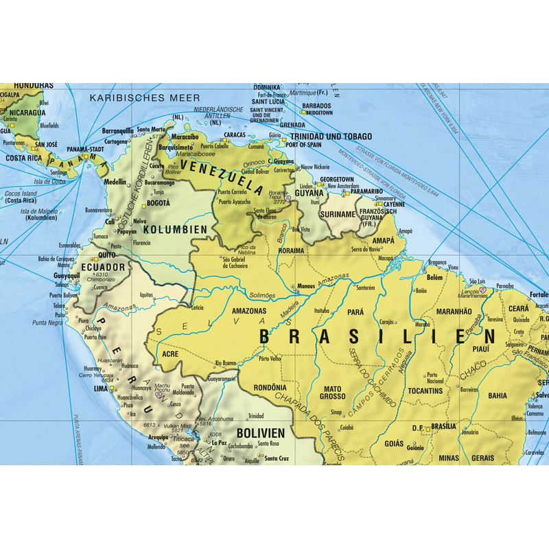 Die unterschiedlich eingefärbten Länder der politischen Karte sind in deutscher Sprache beschriftet. Des weiteren sind die Schifffahrtslinien, Seehäfen und internationale Flughäfen eingezeichnet. Die Bacher-Weltkarte wird durch ein Geländerelief/ Schummerung sowie ein Meerestiefenrelief vervollständigt.
