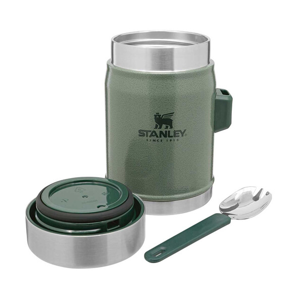 Stanley CLASSIC FOOD JAR, de culoare verde ciocan, este ideal pentru micile mese calde: cu o capacitate de 0,4 litri, recipientul pentru alimente menține mâncarea caldă până la 7 ore. Mâncarea rece rămâne rece până la 7 ore datorită izolației cu vid din oțel inoxidabil cu pereți dubli. CLASSIC FOOD JAR + SPORK este etanș și compact. Pachetul include un spork din oțel inoxidabil, adică o lingură/furculiță. Produsul este rezistent la mașina de spălat vase și nu conține BPA.