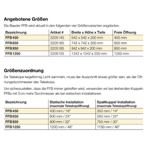 FlatFieldBox (FFB) de la Baader Planetariu este soluția optimă pentru realizarea unor imagini flat perfecte în observatoarea dvs., indiferent de condițiile de iluminare exterioare. Disponibilă în patru dimensiuni – 450 mm, 650 mm, 850 mm și 1250 mm – acoperă o gamă largă de diametre ale telescoapelor. Acest lucru permite o utilizare flexibilă pentru diferite tipuri de telescoape.
