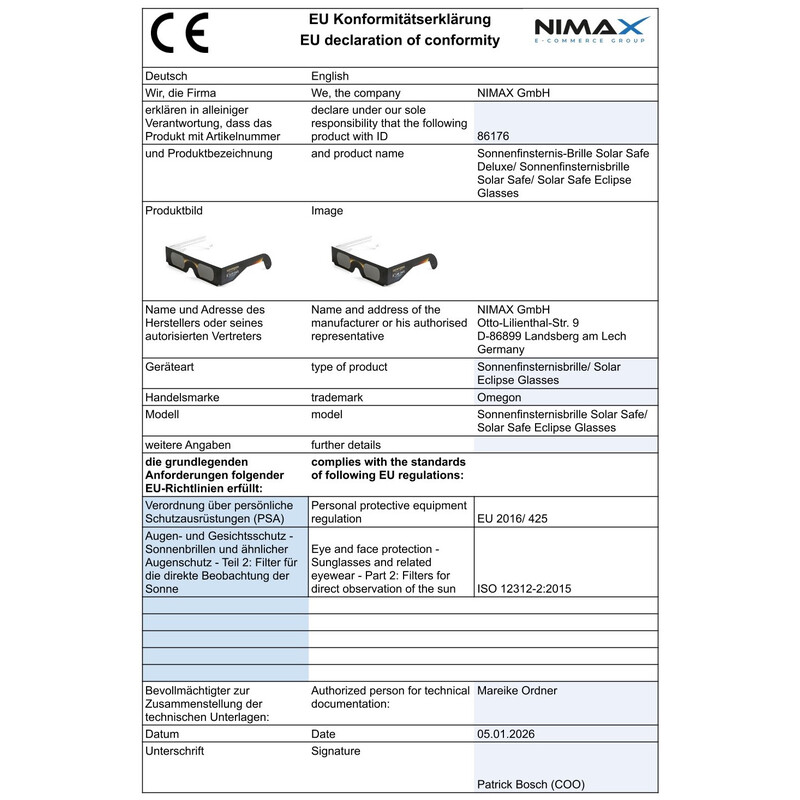 Un eveniment rar: Luna se interpune în fața Soarelui. Doriți să trăiți și dumneavoastră această experiență? Ochelarii pentru eclipsă Omegon fac acest lucru posibil. În siguranță și fără compromisuri. Ochelarii speciali pentru eclipsă vă protejează ochii în mod ideal atunci când faceți observatii la Soare fără mărire.