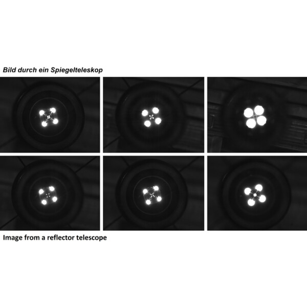 Colimatorul optic LED TSMKOLLI conține un obiectiv achromatic în interior, care poate fi utilizat cu un ocular suplimentar sau o cameră astronomică. Acesta funcționează ca un mic tub optic în interiorul focuserului manual. Patru LED-uri formează o serie de lumini concentrice pe fiecare suprafață optică a telescopului. Suprafețele oglindelor emit lumini puternice, iar suprafețele lentilelor emit lumini slabe. În acest fel, colimatorul indică în mod obiectiv și clar starea de colimare a telescopului și permite o corectare rapidă.