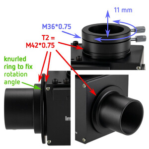 Manșonul de 1,25" este înșurubat pe carcasă cu ajutorul filetului T2. Pe carcasă există, așadar, un filet interior T2 pe partea telescopului.