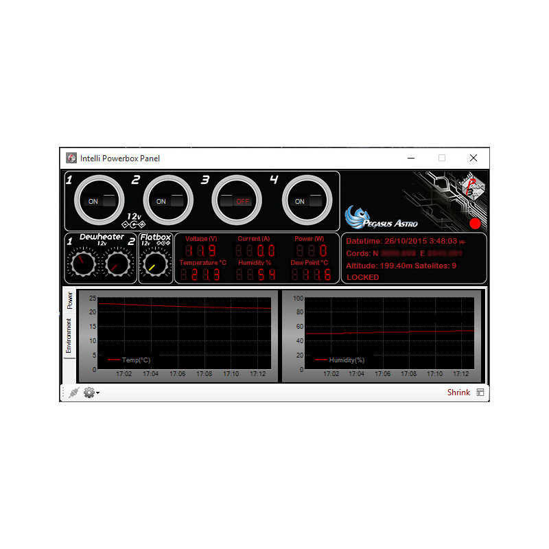 - External Environment Sensor: External temperature & relative humidity sensor is included in the package. Know exactly the environment conditions of your location. The sensor can automaticaly handle the dew heater outlets to adjust the power. Leave to Intelli Powerbox to decide if it is time to turn on your dew heaters! Moreover, you can view the readings of temperature, humidity and dew point in the supplied software. Graphs for temperature and humidity are also available.