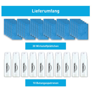 Setul conține 30 de plăcuțe cu substanță activă și 10 cartușe de gaz pentru o funcționare a produselor Thermacell de 120 de ore.