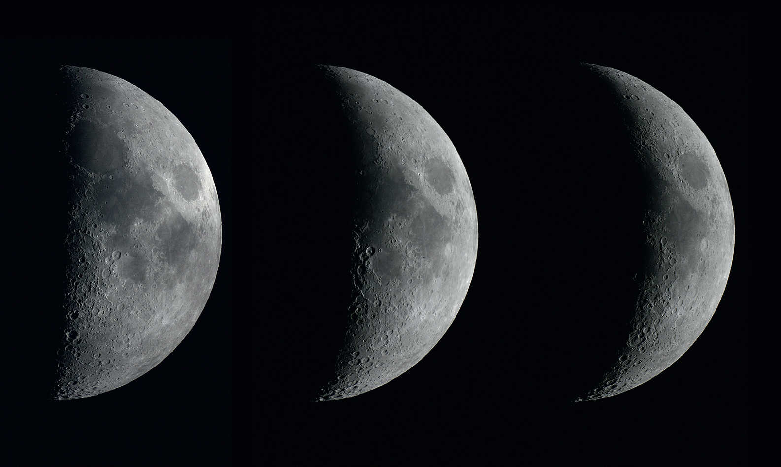 Fazele Lunii în creștere în trei zile consecutive. Fotografiile au fost realizate cu o cameră foto DSLR Canon 450D pe un refractor cu deschiderea de 102 mm și distanța focală de 1.000 mm, la intervale de câte o zi. U. DittlerSfaturi practice