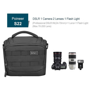 Geanta de umăr Poineer poate acomoda aparate foto de diferite dimensiuni cu mai multe obiective, de la aparate foto fără oglindă până la aparate foto profesionale cu obiectiv 70-200F2.8 (modelele S22 și S26 pot acomoda 1 DSLR cu obiectiv 70-200F2.8). Este disponibilă în trei moduri de transport: ca geantă de mână, geantă de umăr și geantă de șold. Buzunarul frontal, buzunarul lateral și buzunarul din plasă oferă spațiu pentru carduri de memorie, baterii, cabluri și alte obiecte. Disponibilă în 4 dimensiuni