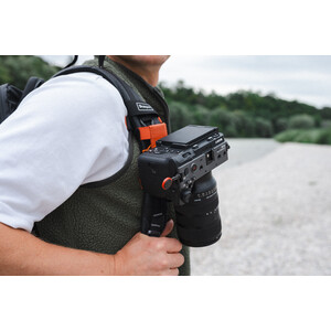 Sistemul de prindere stabil se poate fixa în mod fiabil pe cureaua de umăr sau pe cureaua de șold a rucsacului și asigură libertate de mișcare completă. Datorită plăcii cu eliberare rapidă în standard Arca Swiss, camera poate fi detașată în câteva secunde cu o singură apăsare de buton – pentru momentul perfect, fără a pierde timp.