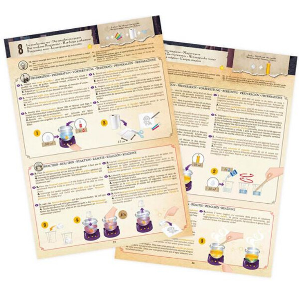 Activează efectele luminoase și fumul și folosește baghetele magice pentru a-ți surprinde publicul. Reactivii sunt incluși pentru a te ajuta să realizezi experimentele cu succes. Foaie cu instrucțiuni în 6 limbi. Necesită 2 baterii LR06, care nu sunt incluse.