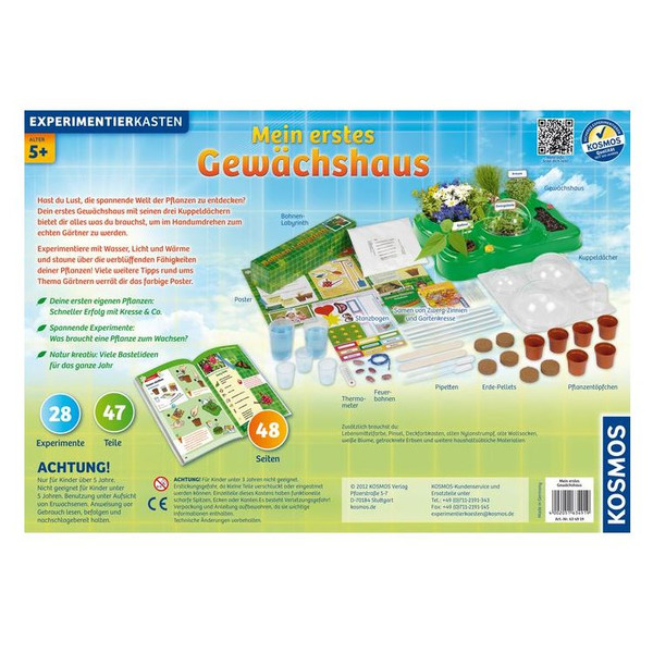 Inhalt: Gewächshaus, Samentütchen (Erbse, Kresse, Zwerg-Zinnie), 6 Erde-Pellets, 6 Pflanztöpfchen, Thermometer, Gips, Pipette, 5 Messbecher, Kunststoffröhrchen, Wollfaden, Holzstäbchen, Spatel, Stanzbögen, Poster, Anleitung (48 S.).