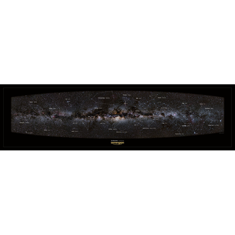 Posterul Omegon cu Calea Lactee vă oferă o impresie foarte specială. Cu o lățime de 150cm puteți savura o panoramă plină de detalii a Căii Lactee. Puteți vedea până în centrul ei, în apropierea constelației Săgetător, veți recunoaște constelații nordice și sudice, chiar și norii roșii de hidrogen, cum ar fi nebuloasa Laguna din Săgetător.