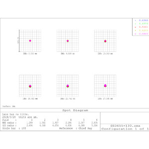 Senzorii mari nu iartă nimic. Quintupletul 130/650 este construit exact pentru acest scop. Corecția optică ajunge până la o diagonală a senzorului de 55 mm. Asta înseamnă: stele punctiforme, chiar și în colțuri. Fără margini neclare. Fără pierderi la marginea imaginii. Construcția quintuplet cu trei elemente ED face diferența. Tripletele clasice ating aici limitele lor. Această optică cu cinci lentile corectează mult mai bine aberațiile sferice, erorile de culoare și curbura câmpului. Obțineți un câmp de imagine mare și util, cu un contrast ridicat.