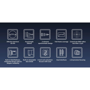 Cu intensitatea sa luminoasă ridicată de f/4,66 și elementul integrat de aplatizare a câmpului vizual, HOPE D60 este un adevărat Astrograf și oferă un câmp vizual larg și corectat fără accesorii suplimentare. Un focuser cu reducere și conexiuni filetate versatile facilitează configurarea și permit utilizatorilor avansați un control precis la fotografierea galaxiilor, nebuloaselor și câmpurilor stelare.