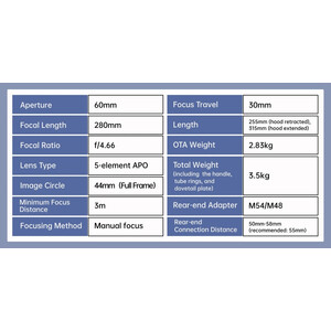 - Raport de deschidere rapid de f/4,66: capacitate ridicată de colectare a luminii pentru fotografierea obiectelor din cerul profund cu câmp larg, care permit vizualizarea detaliilor chiar și la timpi de expunere scurți.