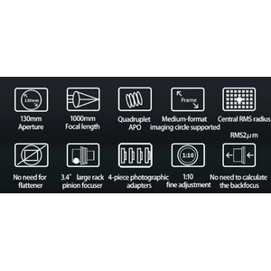 FF130 este livrat cu un capac de rouă extensibil, un tub de înaltă calitate, frezat CNC, precum și piese decorative. OTA cântărește 10,5 kg - pachetul complet cu inele de prindere și șină Losmandy cântărește 12,5 kg. Focuserul manual stabil de 3,4" este livrat cu un rotator de 360° și un călcâi pentru căutător. Adaptoare pentru cameră M86, M68, M54 și M48 sunt, de asemenea, incluse. Adaptorul M48 are un filet interior pentru instalarea filtrelor de 2".