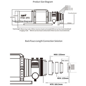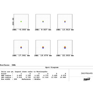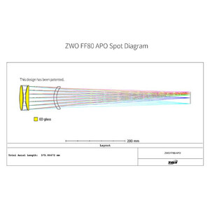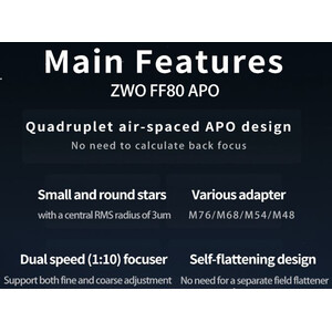 ZWO FF80 Quadruplet este un refractor apochromat foarte compact pentru astrofotografie, cu un câmp de imagine corectat până la format complet și observatii până la cea mai mare mărire. Telescopul are un raport de deschidere de f/7,5 la o distanță focală de 600 mm. FF80 are un design cvadruplet cu două lentile ED, ceea ce permite o suprimare excelentă a aberației cromatice.