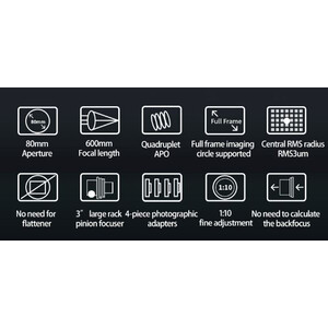 Cu aplatizatorul integrat, FF80 oferă avantaje mari în astrofotografie: luminează senzori full-frame și asigură o imagine fină cu stele punctiforme pe axă. Apochromatul este livrat cu un capac de rouă extensibil, un focuser manual de 3" cu rotație de 360°, un suport pentru căutător Vixen/GP, precum și patru adaptoare foto diferite (M76, M68, M54 și M48). Tubul în sine cântărește 3,9 kg, iar cu inele de prindere și șină, greutatea totală este de 4,7 kg.